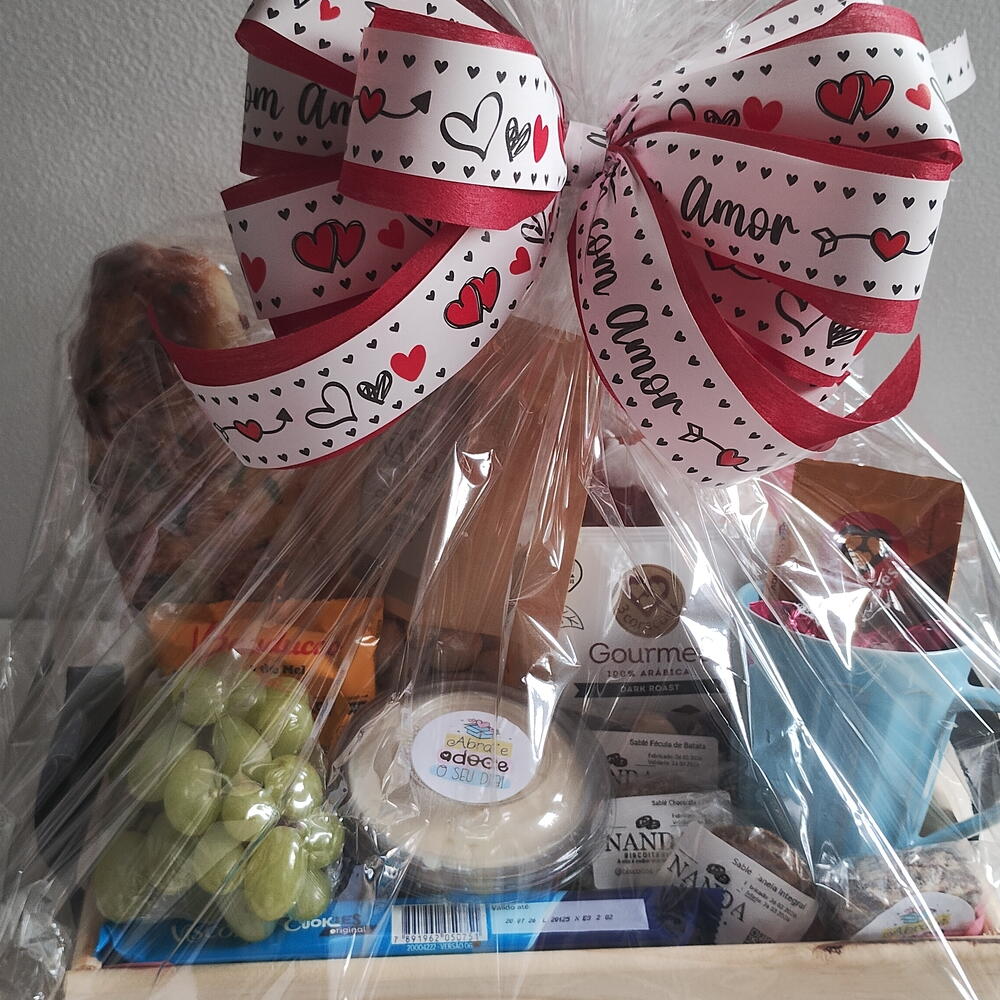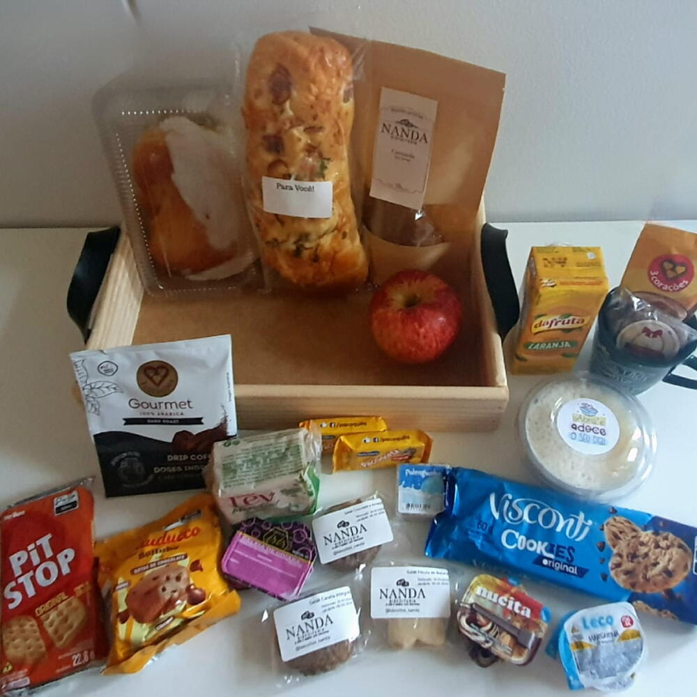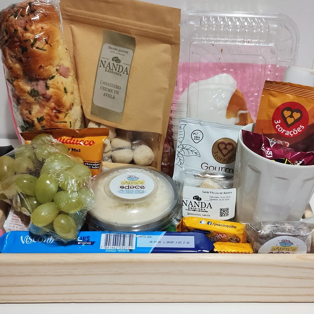 torradas - 1 un. caneca - 1 un. suco - 1 un. pão doce - 1 un. biscoito salgado - 1 un. cappuccino - 1 un. polenguinho - 1 un. mini bolo - 1 un. cartão para mensagem - 1 un. sachê de açúcar - 2 un. blister de creme de amendoim - 2 un. sachê de adoçante - 2 un. laço decorativo - 1 un. blister de geléia 10g - 2 un. blister de manteiga 10g - 2 un. dripp café - 1 un. paçoquinha 18g - 2 un. cookies com gostas de chocolate - 1 un. fruta de época - 1 un. palha italiana gourmet artesanal - 1 un. celofane para fechamento - 1 un. pão tipo veneza - 1 un. mousse gourmet artesanal - 1 un. folha de celofane ou papel de seda - 1 un. biscoito amanteigado artesanal - 100 gr. bandeja mdf ou cesta - 1 un. amanteigados artesanais sabores variados - 6 un.