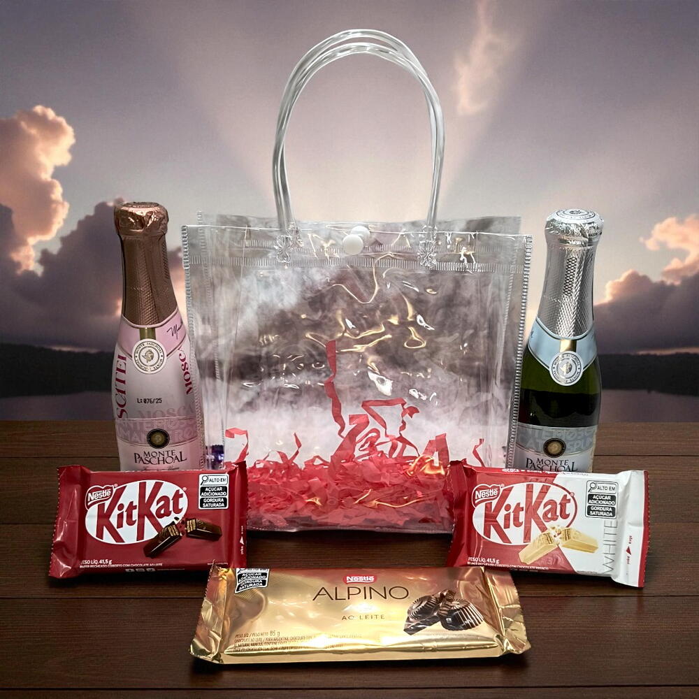 kit kat 41 g - 2 un. alpino ao leite 85 g - 1 un. espumante monte paschoal moscatel rosé - 1 un. espumante monte paschoal moscatel branco - 1 un. sacolinha em pvc transparente 20x20 cm - 1 un.