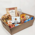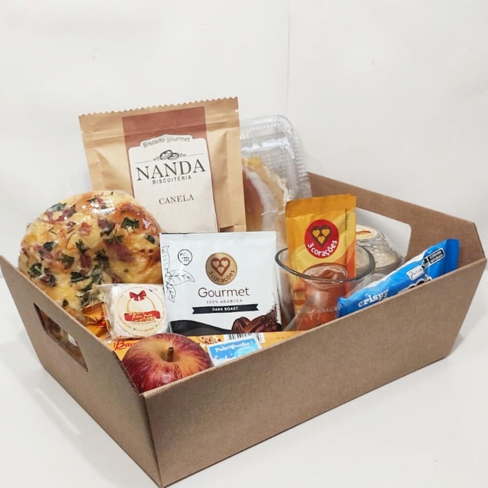 caneca - 1 un. suco - 1 un. pão de mel - 1 un. torrada - 1 un. pão doce - 1 un. biscoito salgado - 1 un. cappuccino - 1 un. polenguinho - 1 un. mini bolo - 1 un. cartão para mensagem - 1 un. drip coffee - 1 un. sachê de açúcar - 2 un. sachê de adoçante - 2 un. laço decorativo - 1 un. fruta da época - 1 un. blister de geléia 10g - 2 un. cesta de vime ou cartonada - 1 un. blister de margarina (10g) - 2 un. cookies com gostas de chocolate - 1 un. palha italiana gourmet artesanal - 1 un. celofane para fechamento - 1 un. pão tipo veneza - 1 un. biscoito amanteigado artesanais - 1 un. mousse gourmet artesanal - 1 un. folha de celofane ou papel de seda - 1 un. amanteigados artesanais - 6 un. blister de creme de avelãs - 2 un.