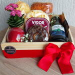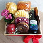 Uma opção deliciosa e charmosa! Nossa bandeja de madeira decorada traz waffles, iogurte grego, panificação salgada, potinho com creme de ricota, donuts, maçã fresca, suco de uva integral, sachê de cappuccino e uma linda planta suculenta. Tudo embalado com carinho em celofane e finalizado com um laço especial. Perfeita para presentear ou tornar qualquer momento ainda mais especial!