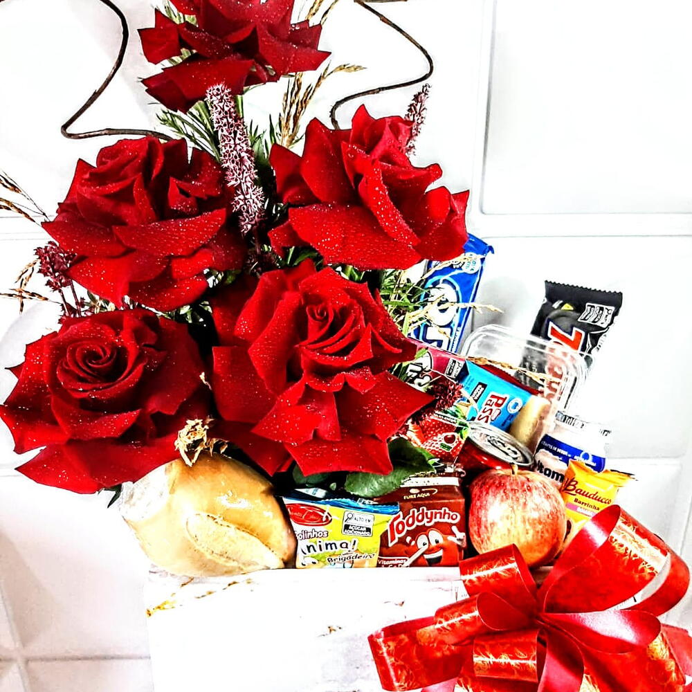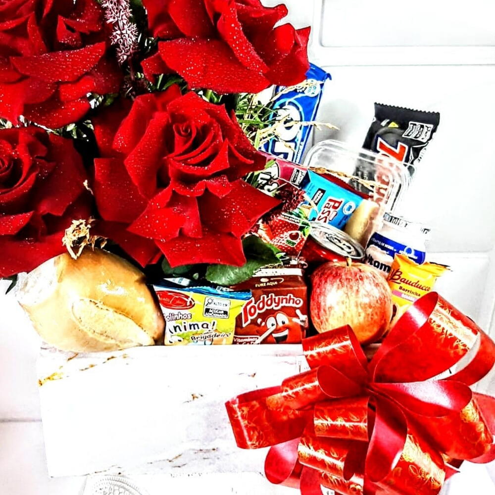 iogurte - 1 un. maçã - 1 un. suco - 1 un. frios - 1 un. pão francês - 1 un. bolacha oreo - 1 un. tubin - 1 un. todinho - 1 un. cesta de café da manhã individual - 1 un. bolinho ( santa edwiges ) - 1 un. bolinho ( bauducco ) - 1 un. coca cola ( lata ) - 1 un. passa tempo - 1 un. cookies ( toddy ) - 1 un. buquê com 5 rosa importadas lindíssimas - 1 un.