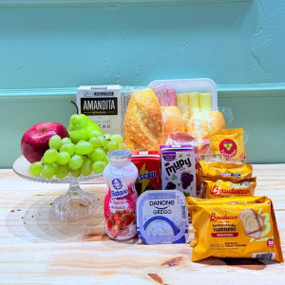 bolinho bauducco - 2 un. torrada bauducco - 2 un. sachê de café - 1 un. tipos de pães - 3 un. achocolatado 200 ml - 1 un. tipos de frutas da época - 3 un. frios (mussarela e presunto) - 1 un. suco de laranja 200ml - 1 un. bolachinha bauducco - 2 un. danone garrafinha - 1 un.