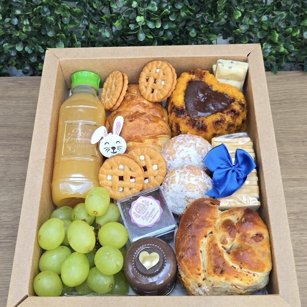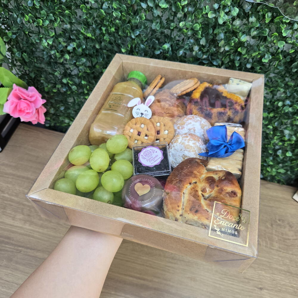 suco de laranja - 1 un. uvas - 1 un. torradas gourmet - 1 un. brigadeiro de pote - 1 un. croissant presunto e queijo - 1 un. geléia de frutas vermelhas - 1 un. pão de calabresa - 1 un. caixa kraft e acetato com tampa - 1 un. contendo bolo de cenoura com chocolate - 1 un. 2 mini dunuts - 1 un. biscoitos decorativos. - 1 un.