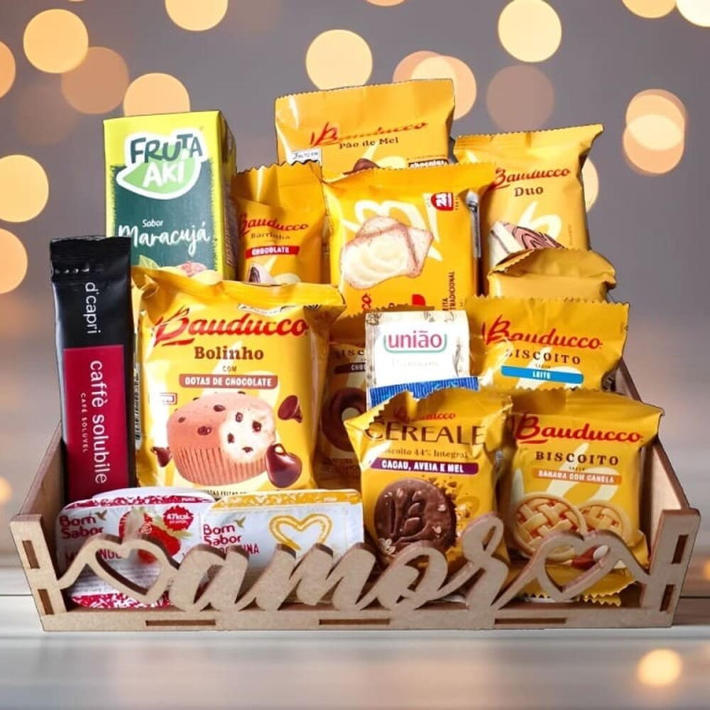 laço - 1 un. pão de mel - 1 un. bolinho - 1 un. torrada - 1 un. geleia - 1 un. margarina - 1 un. adoçante - 1 un. barrinha de chocolate - 1 un. açúcar - 1 un. duo - 1 un. biscoitos sortidos - 5 un. suco caixinha 200 ml - 1 un. café soluvél - 1 un. finalização com papel celofane - 1 un.