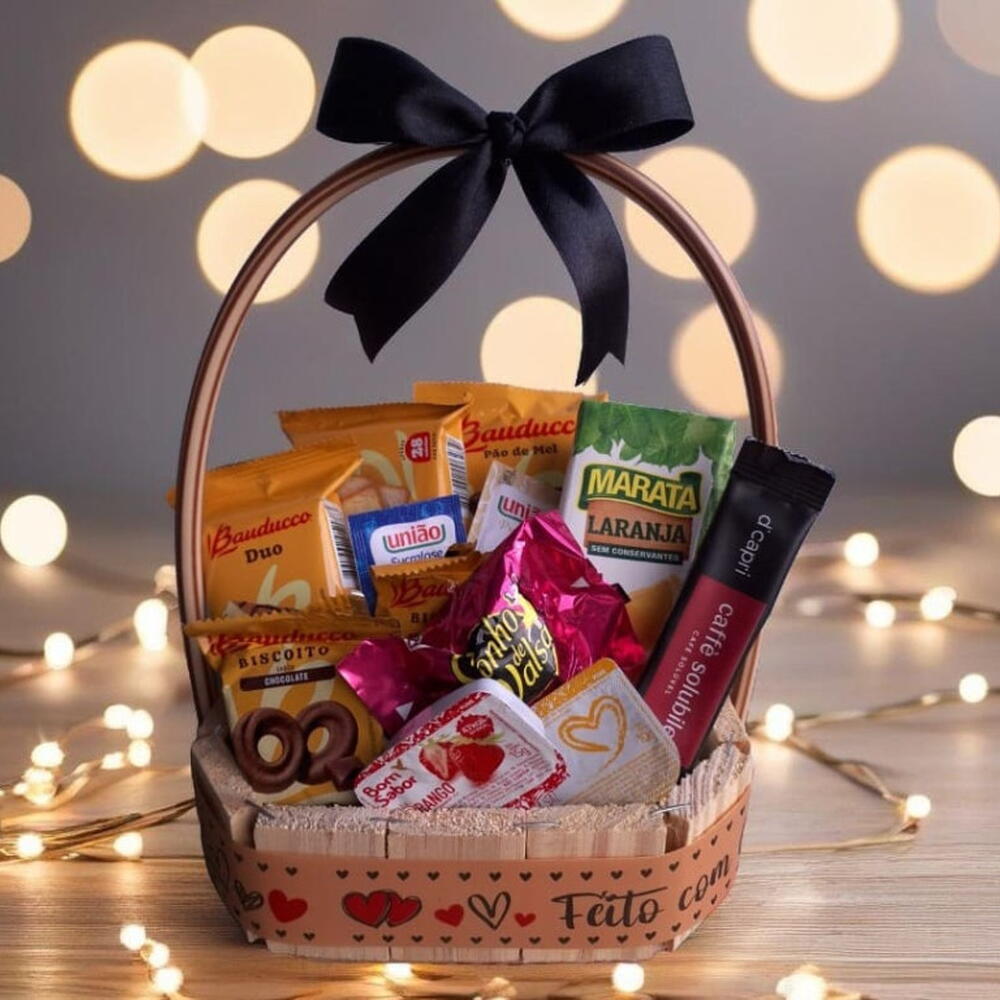 café solúvel - 1 un. cesta - 1 un. laço - 1 un. pão de mel - 1 un. torrada - 1 un. geleia - 1 un. açucar - 1 un. bombom sonho de valsa - 1 un. margarina - 1 un. adoçante - 1 un. embalagem celofane - 1 un. suco caixinha - 1 un. duo - 1 un. biscoitos sortidos - 2 un.