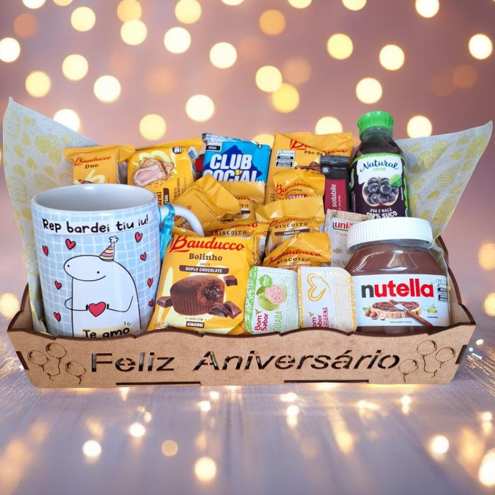 nutella - 1 un. caneca personalizada - 1 un. café solúvel - 1 un. laço - 1 un. pão de mel - 1 un. club social - 1 un. bolinho - 1 un. torrada - 1 un. geleia - 1 un. açucar - 1 un. margarina - 1 un. adoçante - 1 un. embalagem celofane - 1 un. barrinha - 1 un. duo - 1 un. suco natural one - 1 un. biscoitos sortidos - 5 un. caixa mdf personalizada - 1 un.