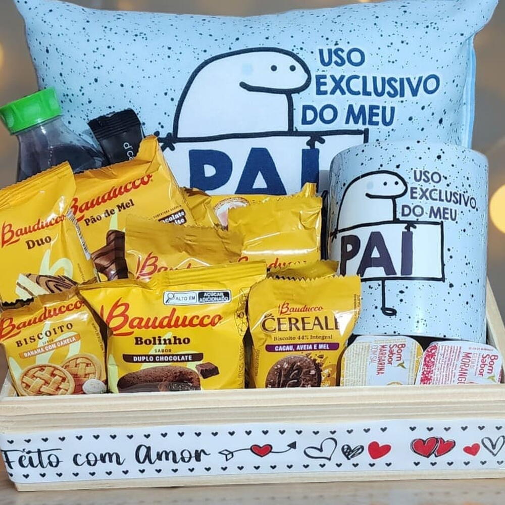 Cesta Cafe da Manhã " Flork" com Almofada e Caneca "Uso exclusivo do meu Pai"