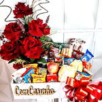 Desfrute de um café da manhã incrível com esta luxuosa cesta recheada de 30 itens deliciosos e variados! A cesta inclui um pacote de cookies, um bolo de chocolate da Santa Edwiges, sequilhos, passa tempo, goiabinhas da Bauducco, duas latas de Nescau, bolinhos da Santa Edwiges, uma linda caneca, uma maçã fresca, um iogurte saudável, mais bolinhos, duas latas de coca-cola, dois pães de mel da Bauducco, duas barras de Tubin, um suco refrescante, uma deliciosa Oreo, ovinhos de amendoim, um pacote de Pit Stop, dois Toddynhos, pães frescos, duas peças de frios, um buquê com cinco belíssimas rosas importadas e, é claro, uma cesta que pode ser usada depois para acomodar o que desejar. Experimente o melhor café da manhã que se pode ter com esta fantástica cesta!