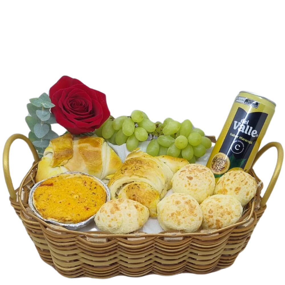 A Cesta Café da Manhã - Pequeno Carinho, ideal para começar o dia com delicadeza, mimo e amor. Um presente compacto e cheio de sabor, perfeito para surpreender quem você ama. Composição: 01 - Croissant Salgado 01 - Croissant Doce 05 - Pão de queijo 01- Quiche Assado 01- Uva 01- Suco Del Valle Lata 01- Rosa Vermelha 01 Cesta,1 Laço Decorativo, 1 Celofane Acabamento.