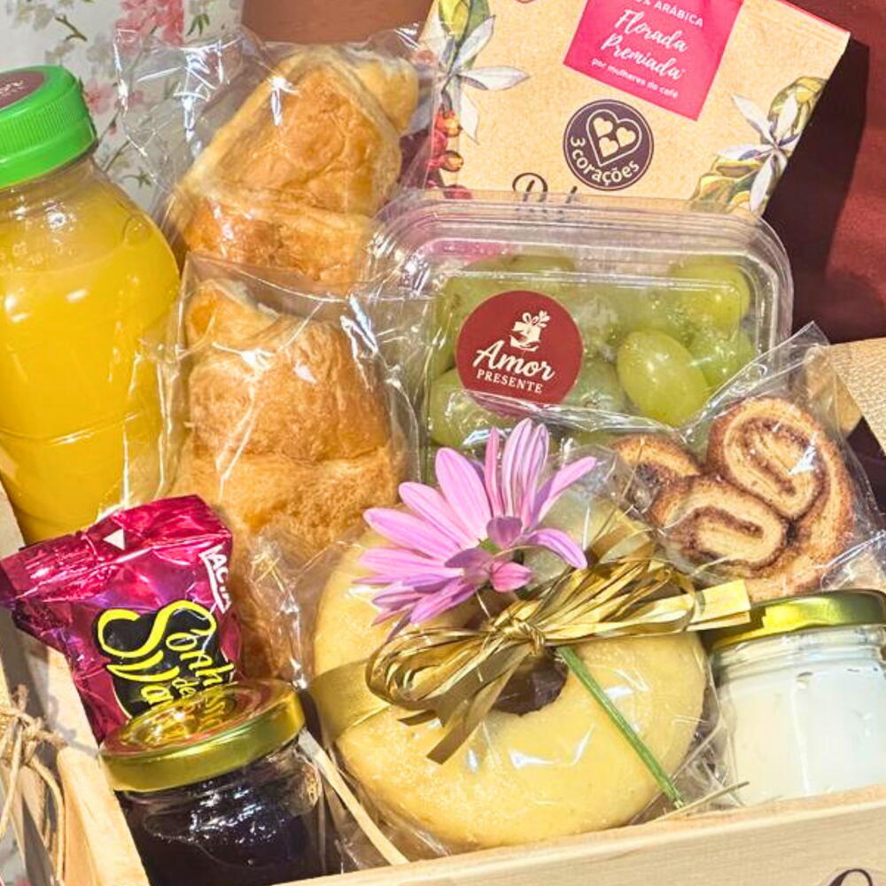 suco integral 300ml - 1 un. chocolate sonho de valsa - 1 un. croissants parisienses - 2 un. drip coffee 3 corações - 1 un. bolinho caseiro 80g - 1 un. palmier crocante - 20 gr. geleia artesanal 40g - 1 un. cream cheese 40g - 1 un.