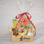 Cesta de café da manhã com itens individuais, perfeita para 1 pessoa 💛 Contém: drip coffee, 2 mini croissants (40g), bolinho (80g), biscoitos (40g), cream cheese + geleia (40g), suco integral (300ml), uva (80g) e 1 bombom. 🎁 Embalagem premium