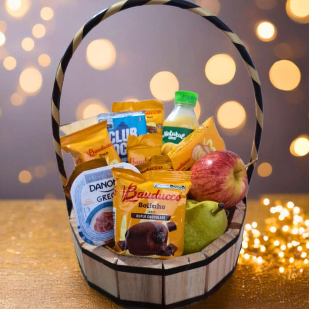 cesta - 1 un. laço - 1 un. pão de mel - 1 un. club social - 1 un. pera - 1 un. bolinho - 1 un. torrada - 1 un. maça - 1 un. embalagem celofane - 1 un. duo - 1 un. suco natural one - 1 un. pct biscoitos sortidos - 3 un. danone greco - 1 un.