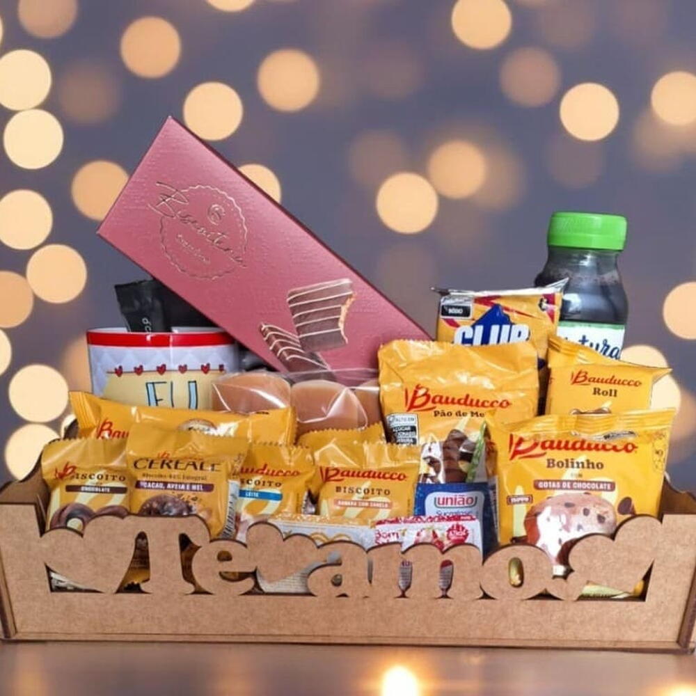 caneca personalizada - 1 un. café solúvel - 1 un. laço - 1 un. pão de mel - 1 un. club social - 1 un. bolinho - 1 un. torrada - 1 un. geleia - 1 un. açucar - 1 un. margarina - 1 un. adoçante - 1 un. caixa mdf - 1 un. embalagem celofane - 1 un. roll - 1 un. bisnaguinhas - 3 un. suco natural one - 1 un. biscoitos sortidos - 5 un. caixa biscoito ao leite cacau show - 1 un.
