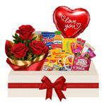 suco. - 1 un. trio de rosa decorativas. - 1 un. torradas. - 1 un. bolachas. - 1 un. bombom sonho de valsa. - 1 un. sachê de café. - 1 un. sachê de açúcar. - 1 un. pães. - 1 un. geléia e manteiga. - 1 un. maça. - 1 un. 1 coração balão personalizado i love you. - 1 un. 1 caneca temática. - 1 un.