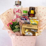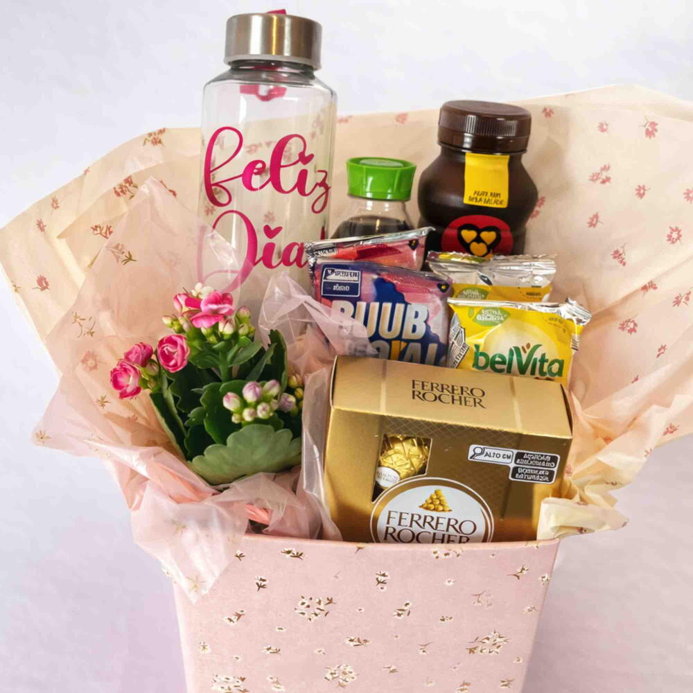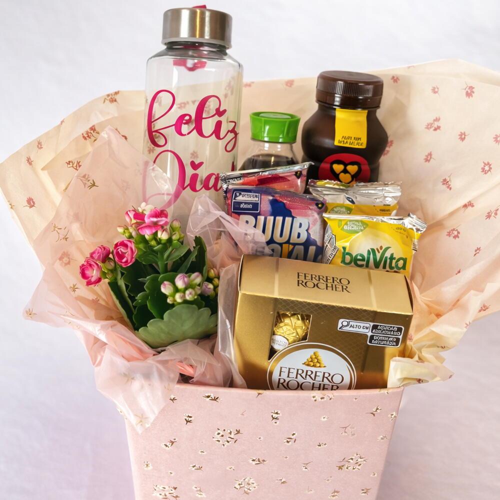 contém: 1 planta floral decorativa kalandiva pote 6 caixa de ferrero rocher com 4 bombons 2 biscoitos belvita 2 biscoitos club social 1 suco natural one 1 cappucino pronto 3 corações garrafinha personalizada ?feliz dia? embalagem decorada temática - 1 un.