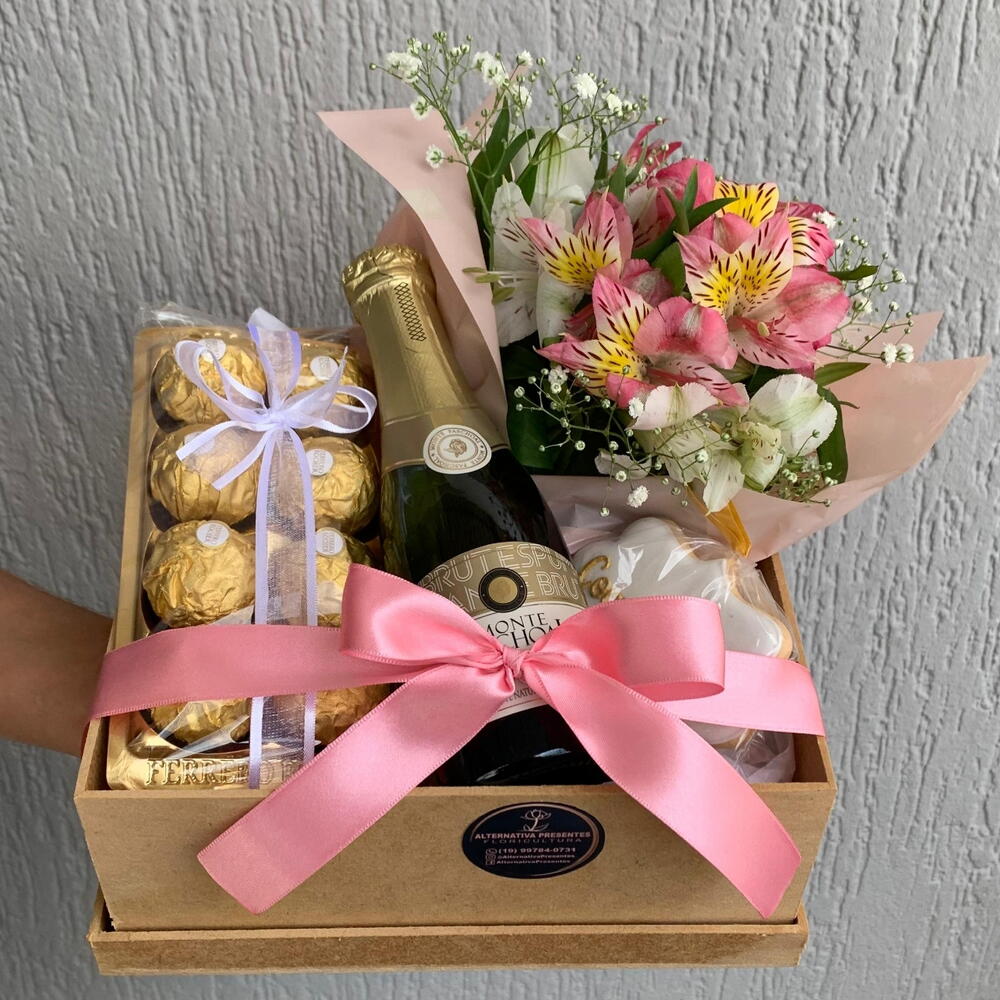 mini buquê de astromélia - 1 un. caixa mdf - 1 un. laço e saco celofane para embrulho - 1 un. biscoito artesanal decorado - 1 un. chocolate ferrerro rocher 100g - 1 un. espumante monte pascoal 187ml - 1 un.