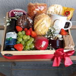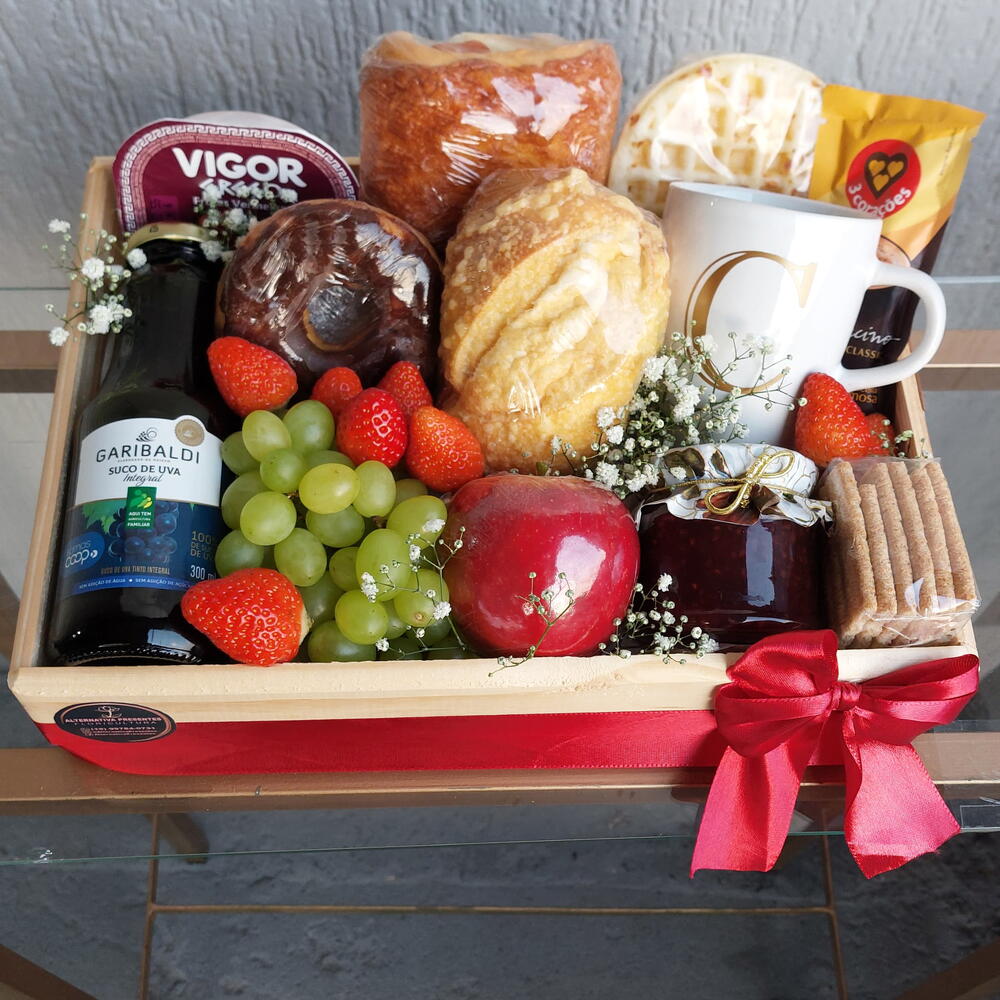 cesta de café da manhã - 1 un. waffle - 1 un. donuts - 1 un. caixa de mdf decorada - 1 un. cesta para namorados - 1 un. uva e morango - 1 un. maçã fresca - 1 un. cesta de frutas - 1 un. paozinho salgado - 1 un. caneca personalizada com inicial do nome - 1 un. torrada bauduco 15g - 1 un. cappuccino 3 corações 20g - 1 un. cesta dia das mães - 1 un. mimo para mozao - 1 un. geleia frutas vermelhas 160g - 1 un.