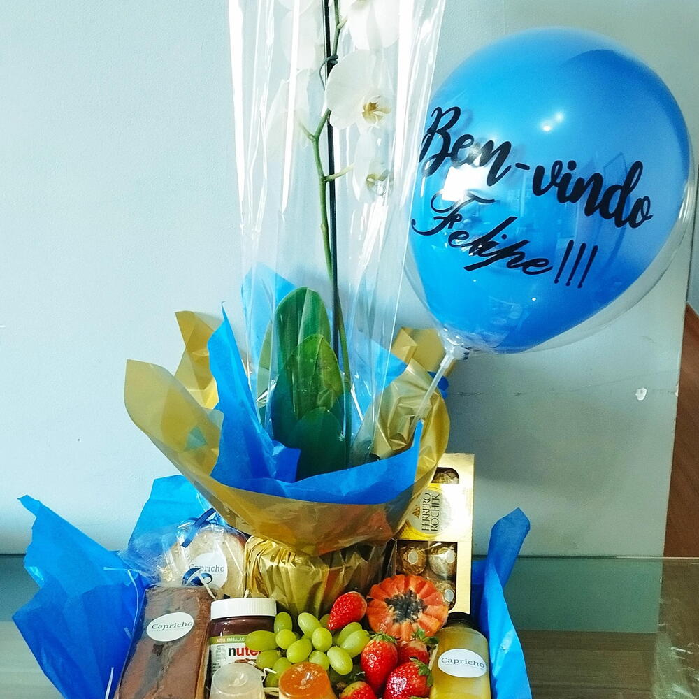 orquídea - 1 un. pão de forma - 2 un. suco de laranja - 1 un. morango - 6 un. cacho de uva - 1 un. pudim - 2 un. mamão metade - 1 un. saco transparente - 1 un. bandeja madeira - 1 un. laço personalizado - 1 un. bolo simples - 1 un. balão personalizado(enviar no chat a escrita) - 1 un.