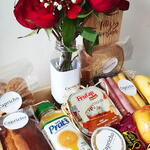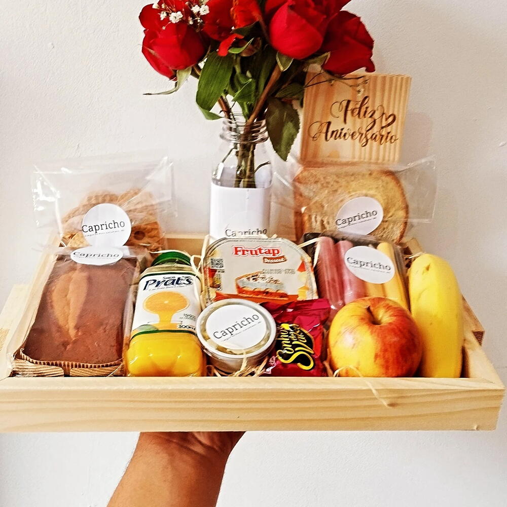 queijo - 2 un. maçã - 1 un. presunto - 2 un. iorgute - 1 un. banana - 1 un. sonho de valsa - 1 un. bolo - 200 gr. suco de laranja - 1 un. saco transparente - 1 un. bolachinha - 50 gr. bolachinha de leite - 10 un. bandeja 30*35 - 1 un. laço personalizado - 1 un. arranjo de 4 rosa - 4 un. potinho de margarina - 1 un. fatia pão de forma - 2 un.