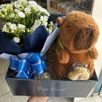 ferrero rocher - 3 un. celofane para acabamento - 1 un. caixa papelão decorada - 1 un. laço para decoração - 1 un. pelúcia capivara 25cm - 1 un.