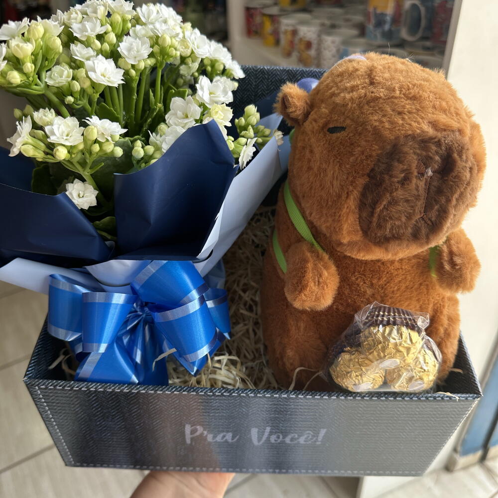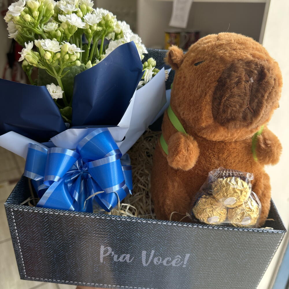 ferrero rocher - 3 un. celofane para acabamento - 1 un. caixa papelão decorada - 1 un. laço para decoração - 1 un. pelúcia capivara 25cm - 1 un.