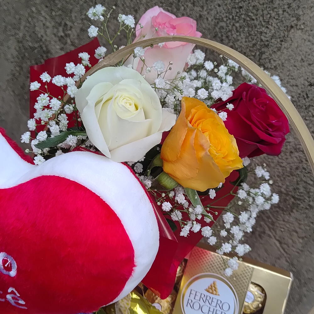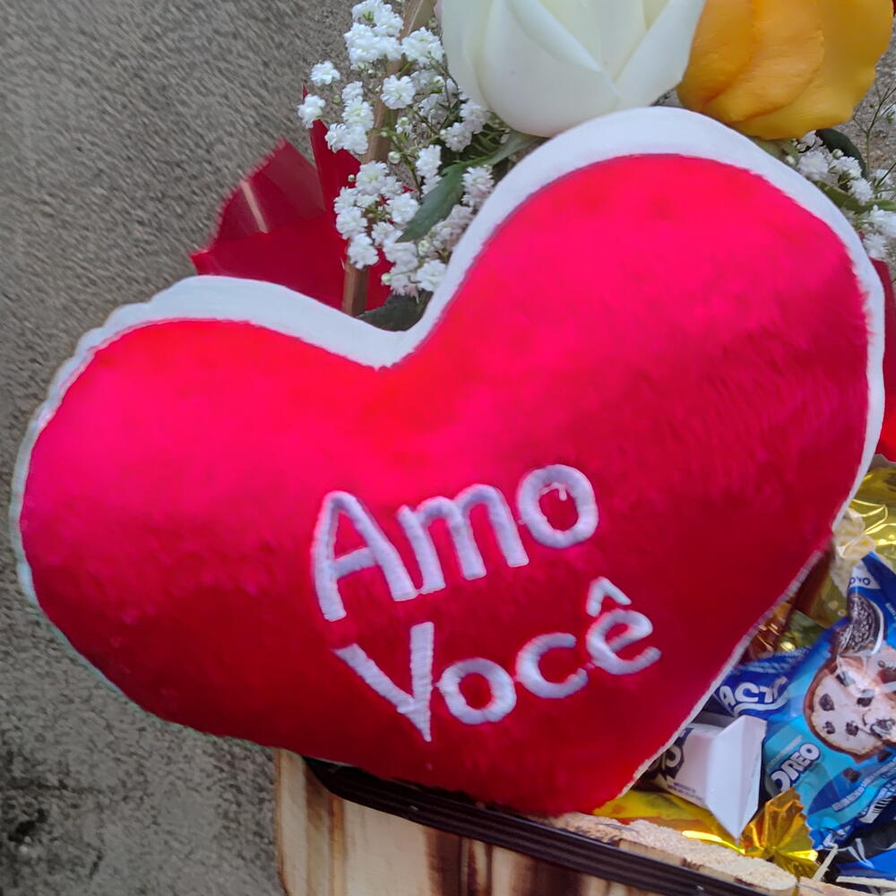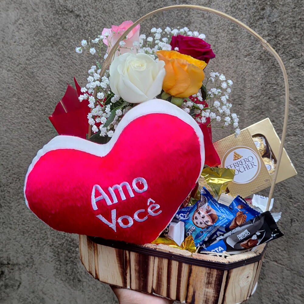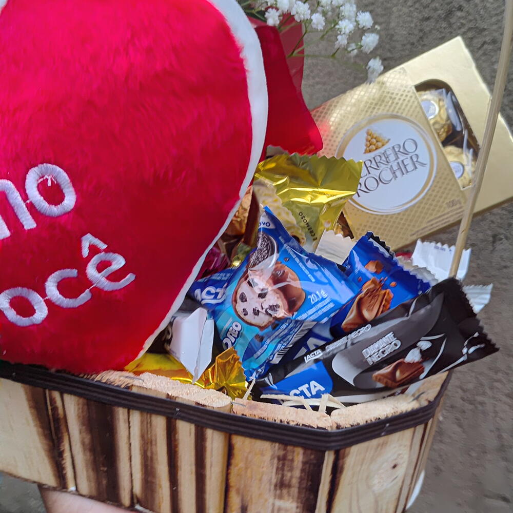 arranjo de flores - 1 un. bombons diversos - 10 un. almofadinha eu te amo - 1 un. cx. ferreiro rocher com 8 - 1 un.