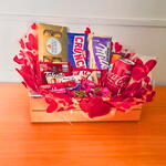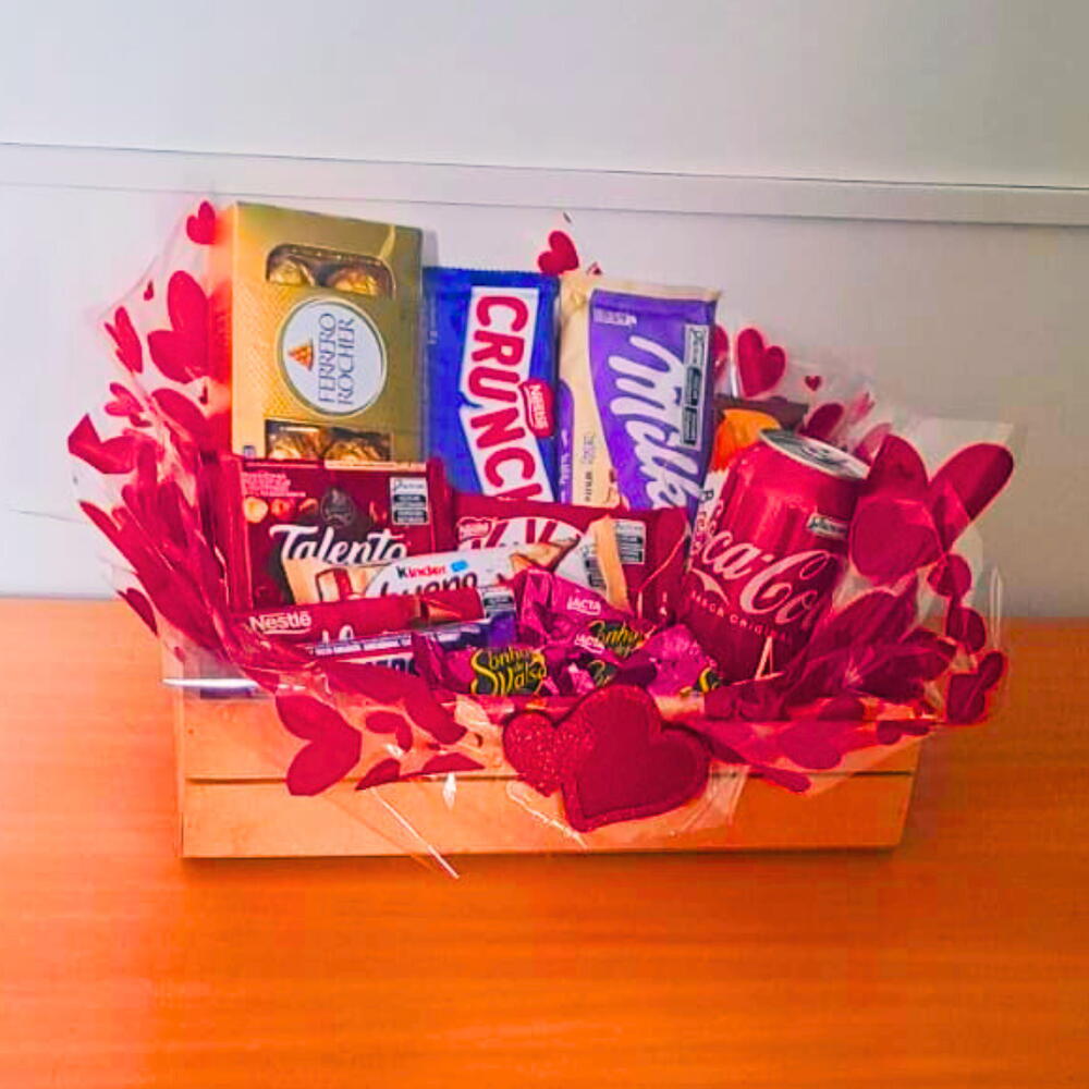 Esta cesta deliciosa é uma verdadeira celebração de sabores que reúne os chocolates mais apreciados em um só kit. Ideal para surpreender em aniversários, datas especiais ou simplesmente para adoçar seu dia. O que você encontra na Cesta: 1 caixa com 8 bombons Ferrero Rocher 1 chocolate ao leite Crunch de 80g 1 chocolate branco Lacta de 80g 1 barra Milka Bubby White de 95g 1 barra Talento Avelãs de 85g 1 Kit Kat de 41,5g 1 chocolate Suflair de 50g 1 Nutella B-ready de 22g 1 Kinder Bueno White de 39g 1 barra Stickers Dark de 42g 4 bombons Sonho de Valsa de 20g cada 1 lata de Coca-Cola de 350ml Tudo acomodado em uma linda caixa de MDF decorada Dimensões da cesta: Altura: 20 cm Comprimento: 30 cm Largura: 20 cm Com essa combinação exclusiva, cada mordida é uma explosão de sabor que vai encantar seu paladar. Por que escolher a Cesta Chocólatra Explosão de Sabor? Variedade Premium: Chocolates selecionados das marcas mais queridas do mercado brasileiro e internacional. Apresentação Elegante: Caixa de MDF decorada, que pode ser reutilizada para guardar lembranças ou outros presentes. Praticidade: Perfeita para presentear com estilo, já pronta para surpreender quem você ama. Surpreenda e encante com esta cesta que é a combinação perfeita entre sabor e sofisticação. Peça agora e garanta uma experiência doce inesquecível!