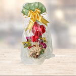 laço dourado - 1 un. bombom sonho de valsa lacta 20gr - 3 un. bombom ouro branco lacta 20gr - 3 un. mini coelho de pelúcia 8x13 cm - 1 un. cesta com alça 13 cm diâmetro 22 cm alça altura - 1 un. balão mini coração vermelho - 1 un. invólucro transparente com ponta decorada verde - 1 un. bala arcor butter toffes sortida - 17 un.