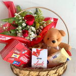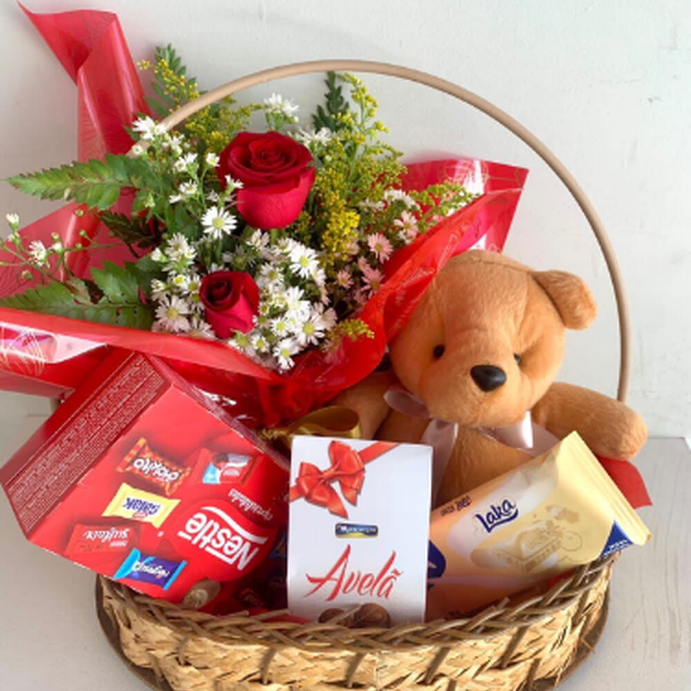 urso de pelúcia - 1 un. buquê de rosa - 1 un. chocolates - 3 un. cesta - 1 un. laço - 1 un. embalagem celofane - 1 un.
