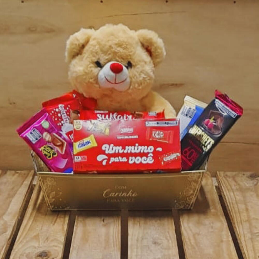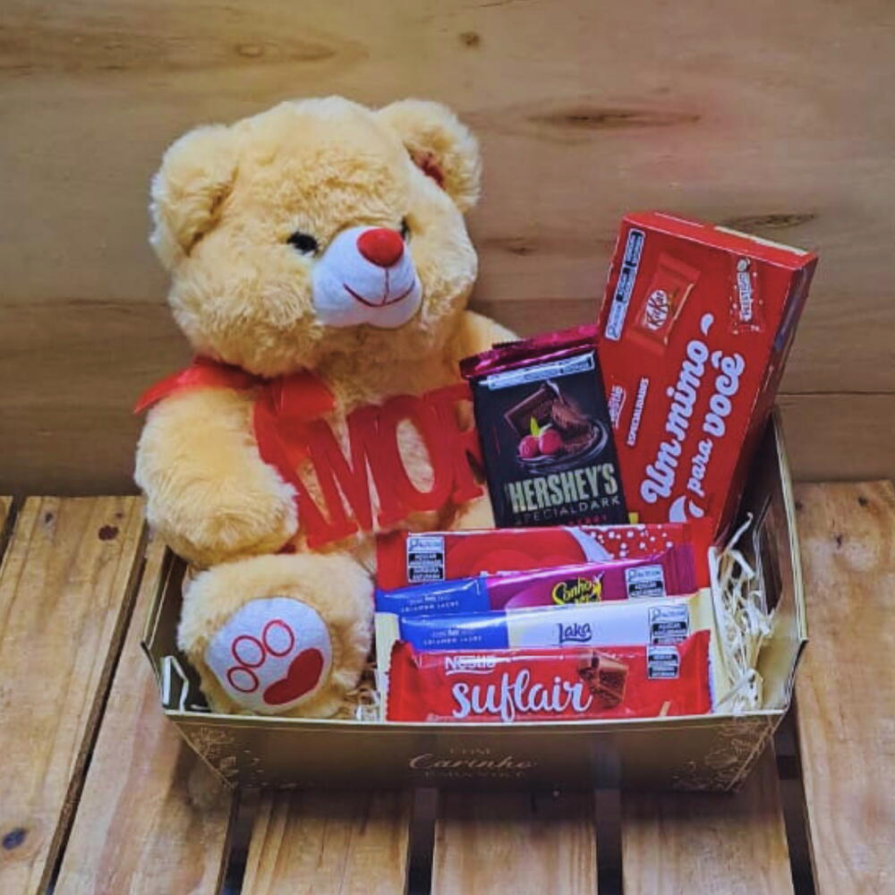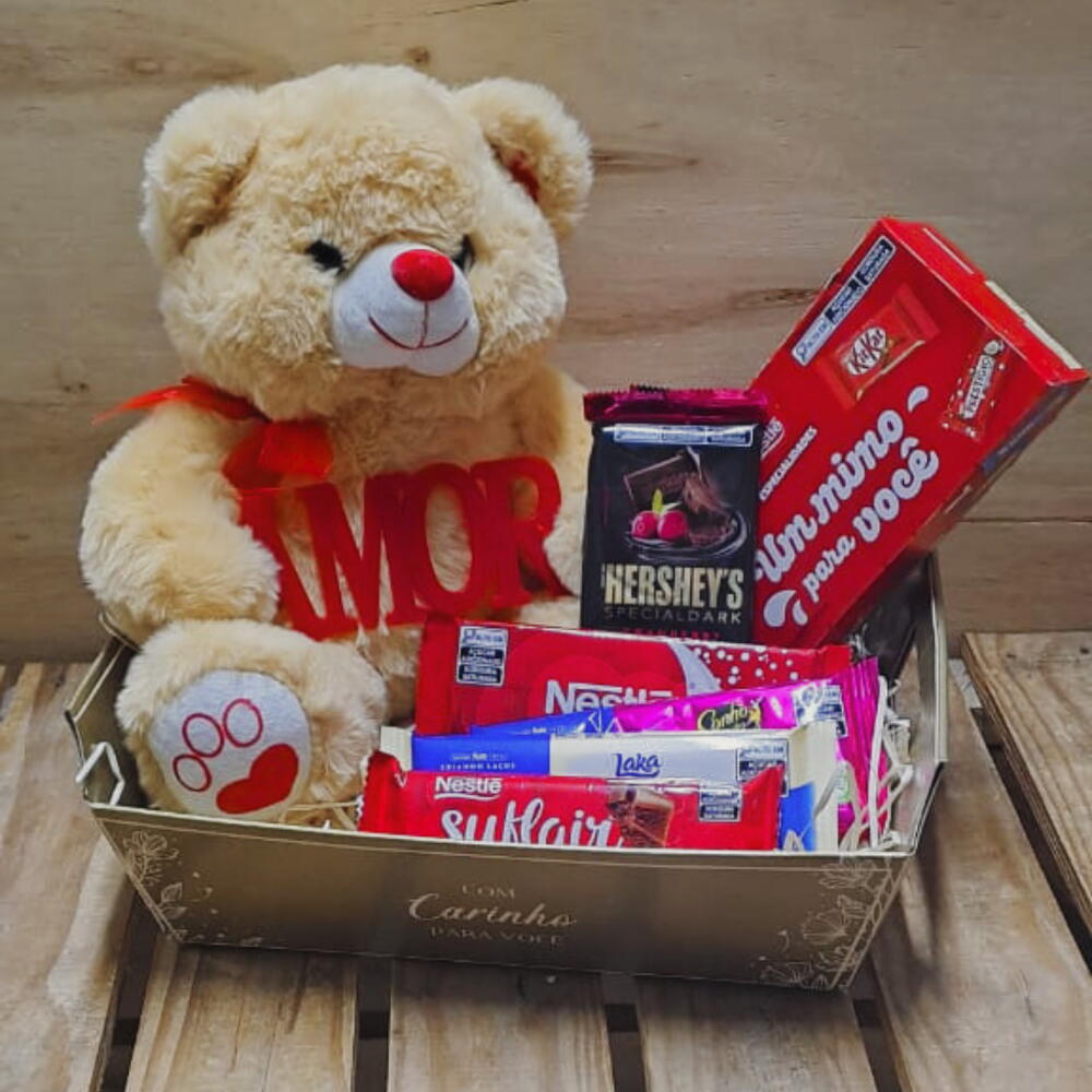 caixa de bombons nestle - 1 un. barra de chocolate sonho de valsa - 1 un. chocolate suflair - 1 un. urso de pelúcia fizzy - 1 un. chocolate lacta oreo - 1 un. chocolate nestlé classic prestígio - 1 un. barra de chocolate hershey's - 1 un. caixa litografada “com carinho pra você - 1 un.