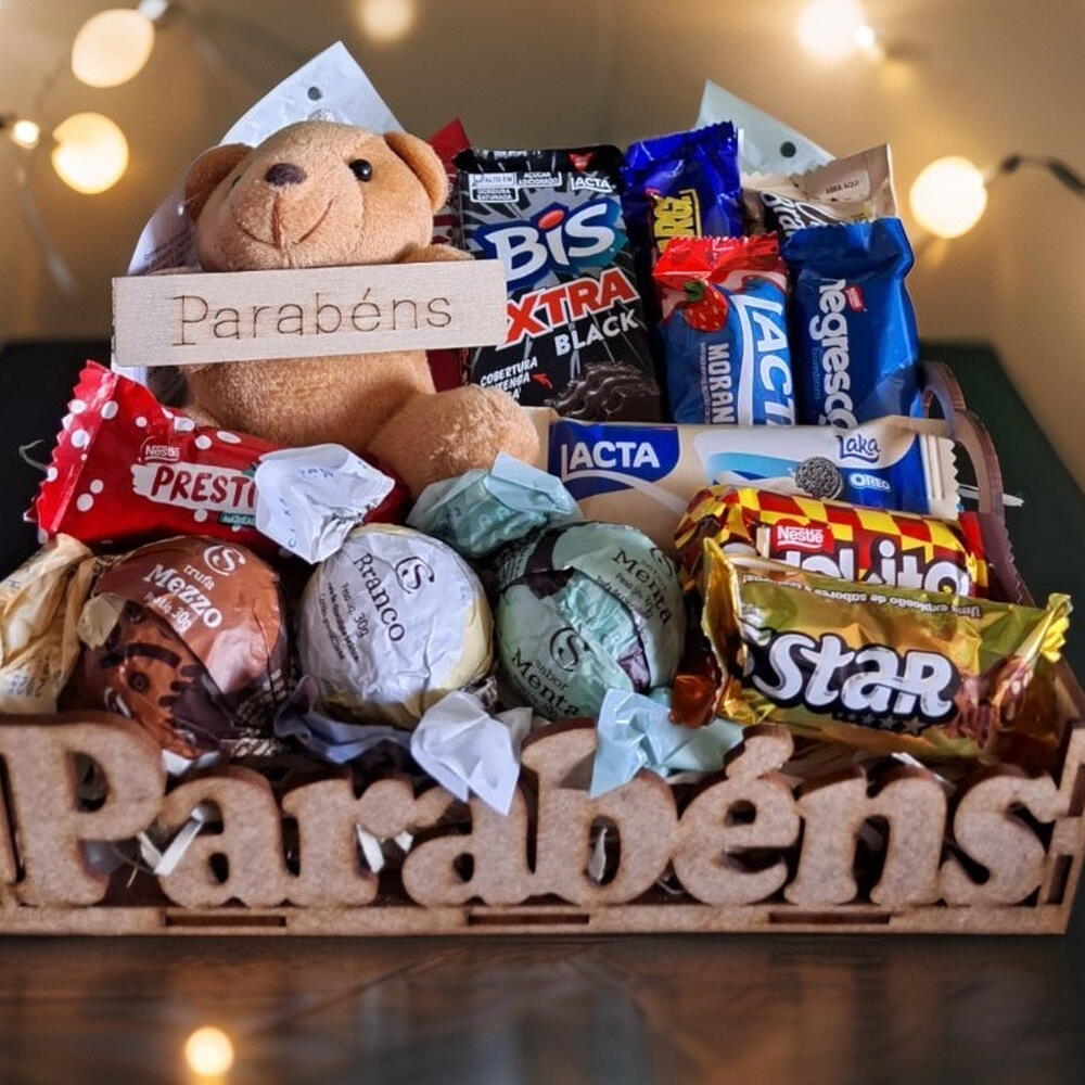kit kat 41g - 1 un. bis 45g - 1 un. trufas cacau show 30g - 3 un. bombons sortidos (lacta e nestlé) - 8 un. mini pelúcia de chaveiro com plaquinha parabéns - 1 un.