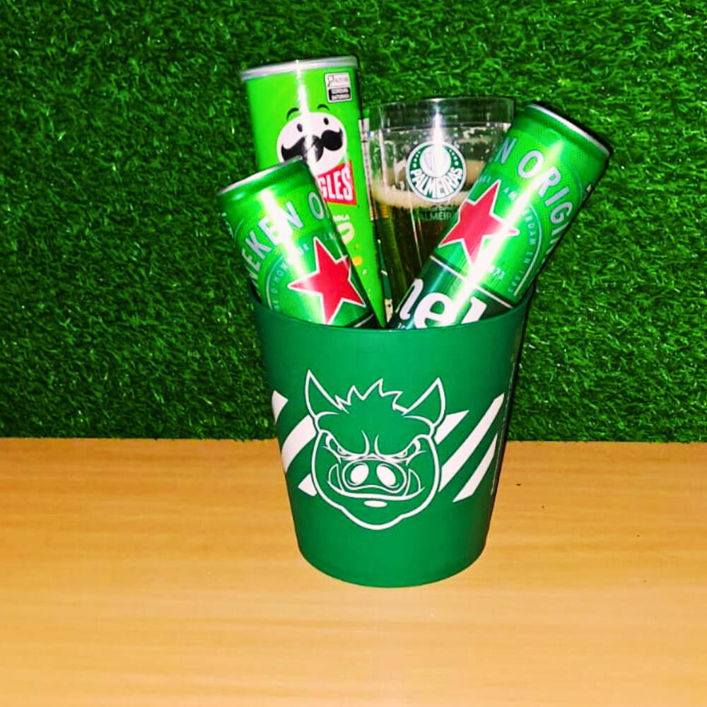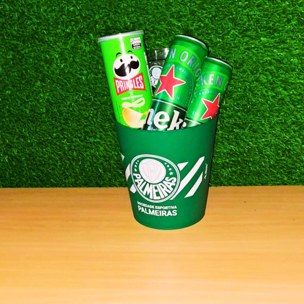 Cesta com Copo Palmeiras – Paixão e Sabor para Celebrar o Amor e o Futebol Surpreenda seu amor , com a Cesta com Copo Palmeiras, um presente exclusivo que une a paixão pelo Verdão e momentos de descontração com muito sabor. Ideal para torcedores que desejam curtir cada jogo com estilo e praticidade! Conteúdo da Cesta: 1 Copo Palmeiras Marca Mileno (Produto Licenciado) Mantenha sua bebida gelada por muito mais tempo! O copo possui uma camada interna de gel isolante térmico, não tóxico, que conserva a temperatura ideal da sua bebida. Basta congelar e usar sempre que desejar. Importante: Não utilize no micro-ondas, forno ou em ambientes com temperaturas acima do freezer. Lave somente à mão para preservar sua qualidade. 1 Balde de Pipoca Palmeiras Marca Allmix (Produto Licenciado) O acompanhamento perfeito para os momentos de torcida, tornando cada lanche ainda mais especial enquanto vibra com o Palmeiras. 2 Cervejas Heineken 350 ml O sabor clássico e suave que combina perfeitamente para brindar cada gol e celebração. 1 Batata Pringles Creme e Cebola 109 g Crocância e sabor irresistíveis para complementar o clima de festa e torcida. Dimensões da Cesta: Altura: 35 cm Diâmetro: 20 cm Por que escolher esta cesta? Produto Oficial e Licenciado: Garantia de autenticidade e qualidade para o torcedor do Palmeiras. Praticidade e Funcionalidade: O copo térmico mantém sua bebida gelada do início ao fim do jogo, proporcionando mais conforto. Combinação Completa: Snacks selecionados e bebidas para momentos especiais a dois ou com os amigos. Presente Ideal para o Dia dos pais : Demonstre seu amor com um presente que une paixão pelo Palmeiras e momentos para celebrar juntos. Transforme seu dia em uma experiência inesquecível com a Cesta com Copo Palmeiras. Torça, brinde e comemore com muito sabor e emoção! Garanta já a sua e faça uma festa alviverde!
