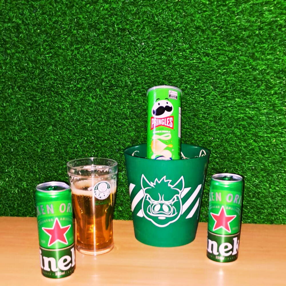 balde pipoca palmeiras - 1 un. batatas pringles sabor creme e cebola - 1 un. cerveja heineken 350 ml - 2 un. copo cerveja gel palmeiras - 1 un.