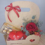 coração pelúcia eu te amo - 1 un. ferrero rocher 100g 8 unidades - 1 un. cesta mdf 27x35 - 1 un. buquê mix de flores - 1 un.