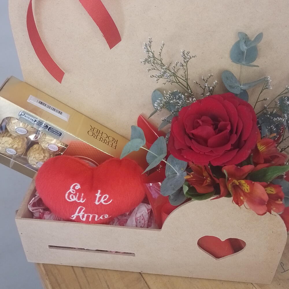 coração pelúcia eu te amo - 1 un. ferrero rocher 100g 8 unidades - 1 un. cesta mdf 27x35 - 1 un. buquê mix de flores - 1 un.