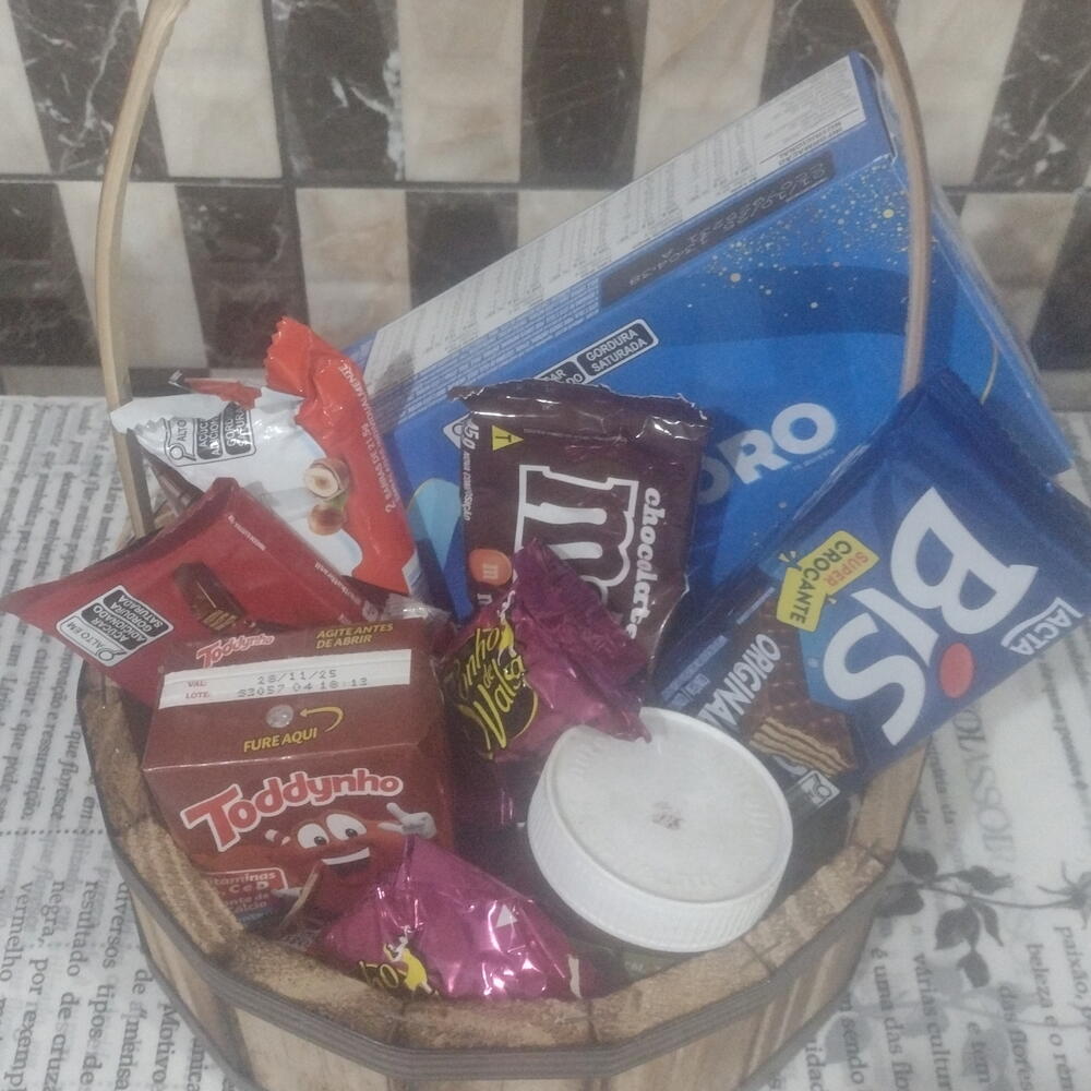 chocolate - 8 un. cesta de vime - 1 un. observação cesta com uma linda embalagem e cartão em falta de algum produto substituído por outro com a mesma qualidade - 1 un.