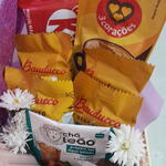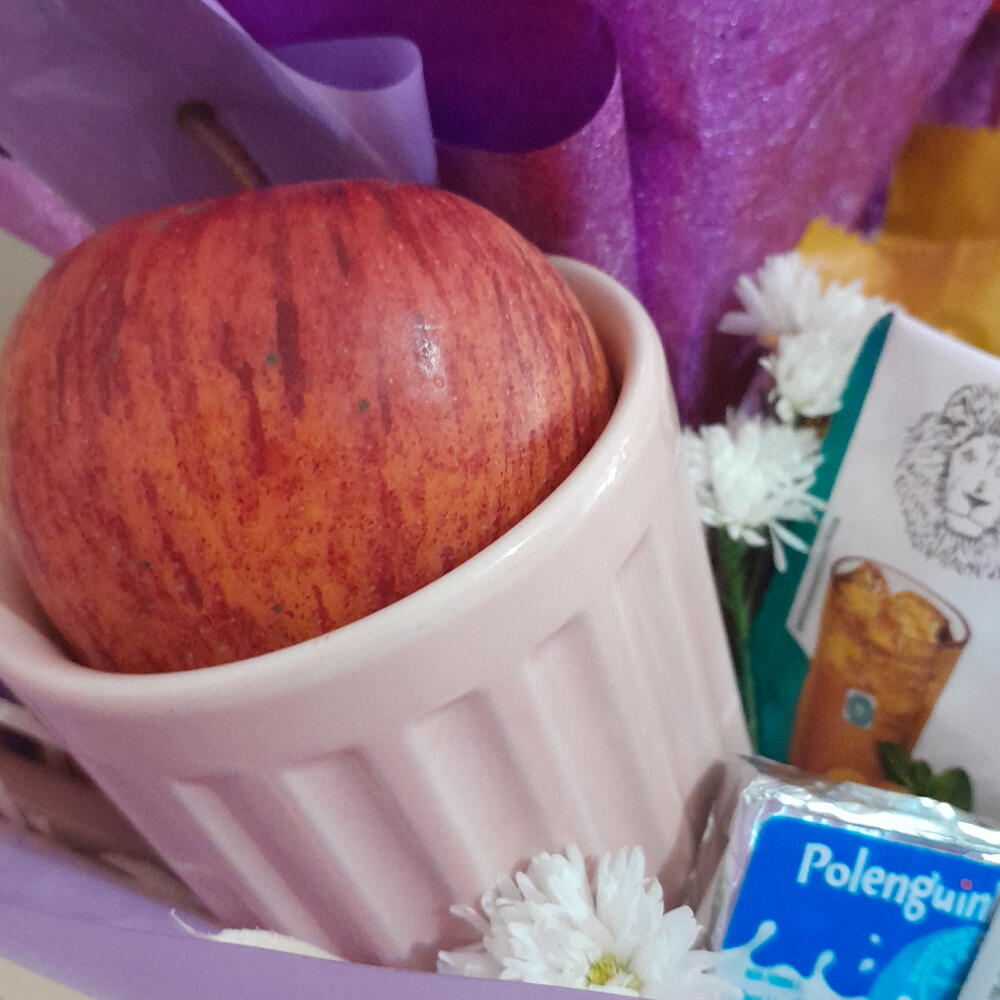 polenguinho - 1 un. biscoito maizena 8g - 2 un. maçã vermelha - 1 un. manteiga vigor 10g - 1 un. biscoito bauducco doce 11gr - 2 un. cappuccino solúvel 3 corações - 1 un. kitkat nestlé 41 5g - 1 un. cesta de madeira com embalagem - 1 un. geleia sortida 15g - 1 un. 1 xícara pequena - 1 un. cha gelado sachê - 1 un. mini buquê com 6 rosa ( cor da rosa da sua escolha) - 1 un.