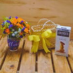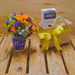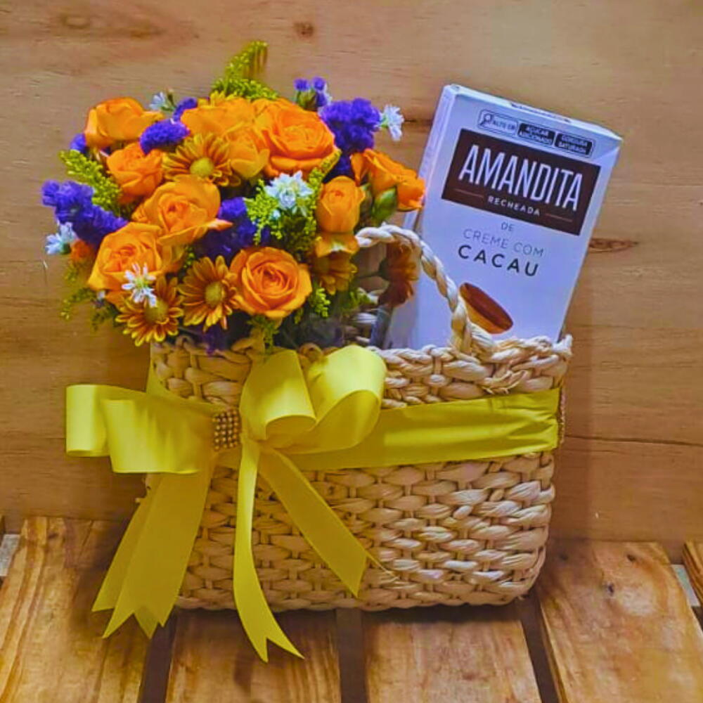 cesta de vime - 1 un. amandita recheada - 1 un. caneca floresça com flores variadas - 1 un.