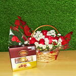 Cesta com Rosas e Bombom Ferrero Rocher