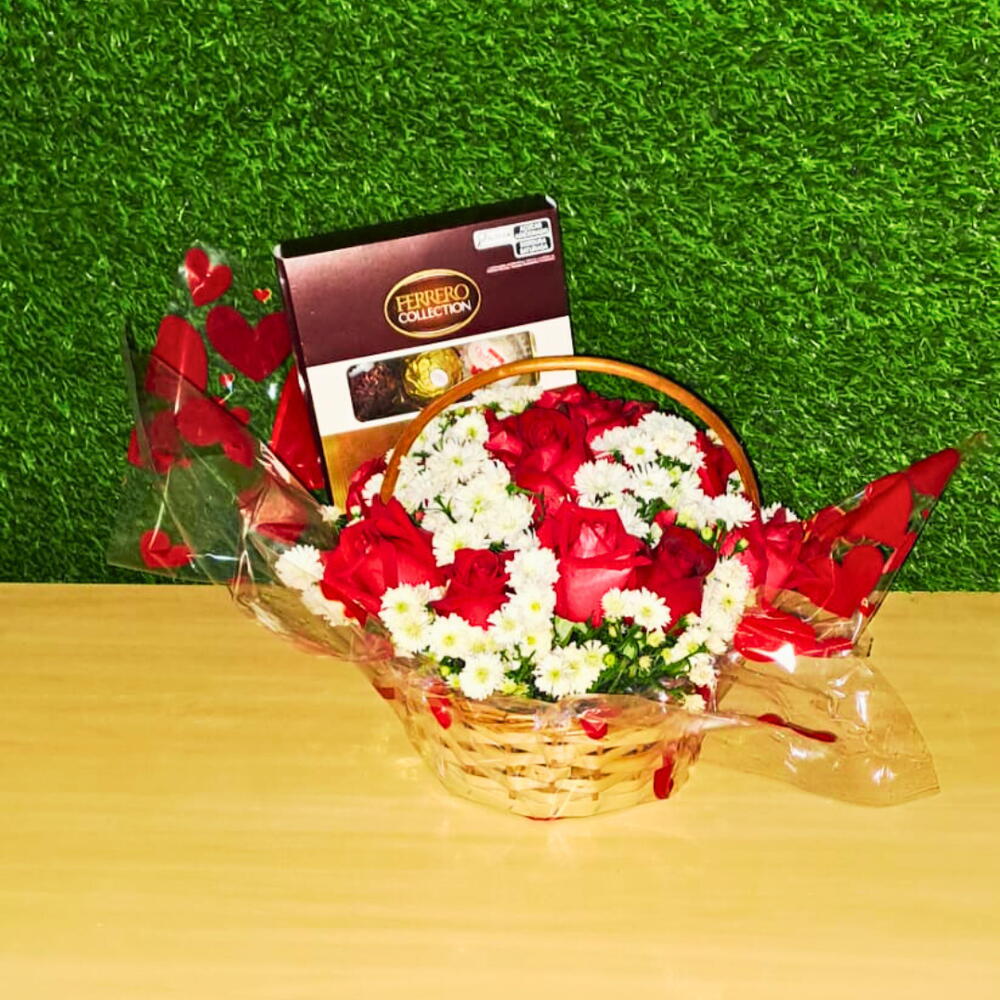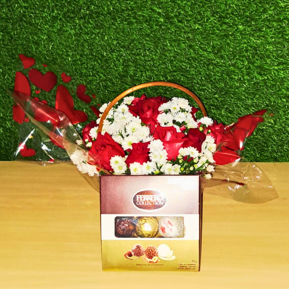 Cesta com Rosas e Bombom Ferrero Rocher