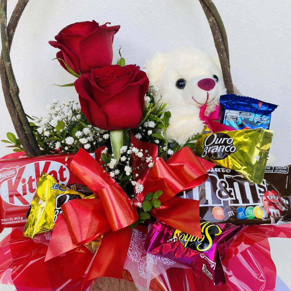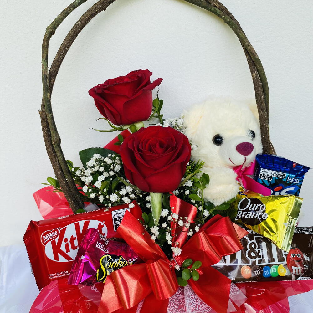 rosa vermelha - 2 un. mosquitinho - 2 un. urso de pelúcia - 1 un. chocolates variados - 5 un. laço - 1 un. cesta rústica - 1 un. verdes da época - 6 un.