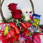 Cesta delicada com rosas frescas e chocolates finos, criando uma combinação perfeita de beleza e sabor para surpreender alguém especial.