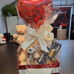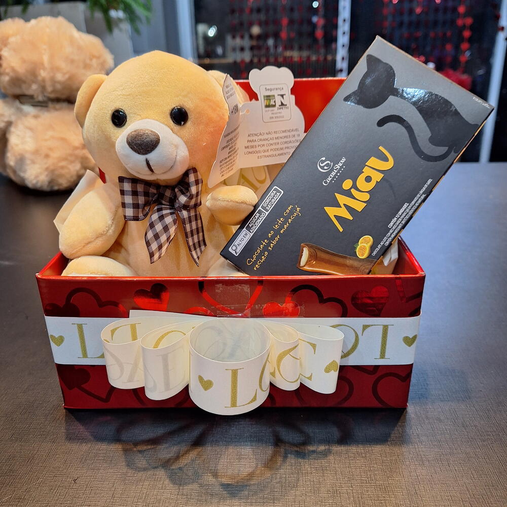 urso - 1 un. chocolate cacau show - 1 un. laço - 1 un. cesta decorada - 1 un. embalagem celofane - 1 un. balão de coração metalizado 10 cm - 1 un.