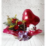 cesta de vime decorada - 1 un. ursinho de pelúcia - 1 un. arranjo com rosa vermelhas - 1 un. balão metalizado coração - 1 un. bombons da cacau show - 8 un.