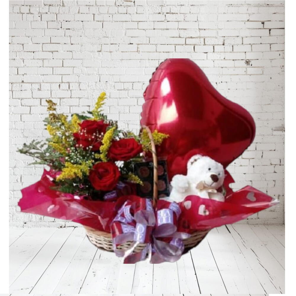 cesta de vime decorada - 1 un. ursinho de pelúcia - 1 un. arranjo com rosa vermelhas - 1 un. balão metalizado coração - 1 un. bombons da cacau show - 8 un.