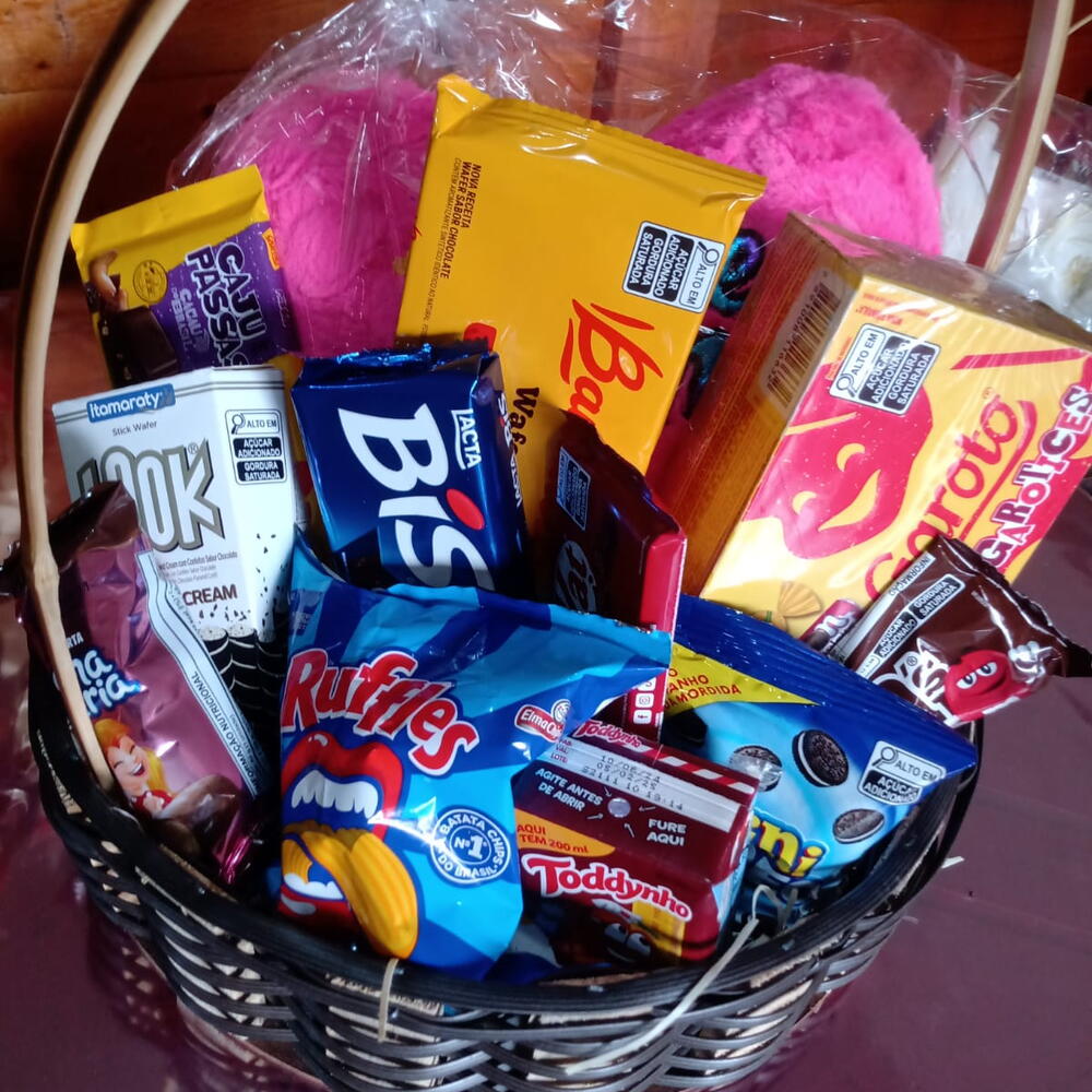 cesta - 1 un. coração - 1 un. chocolates e guloseimas - 10 un.