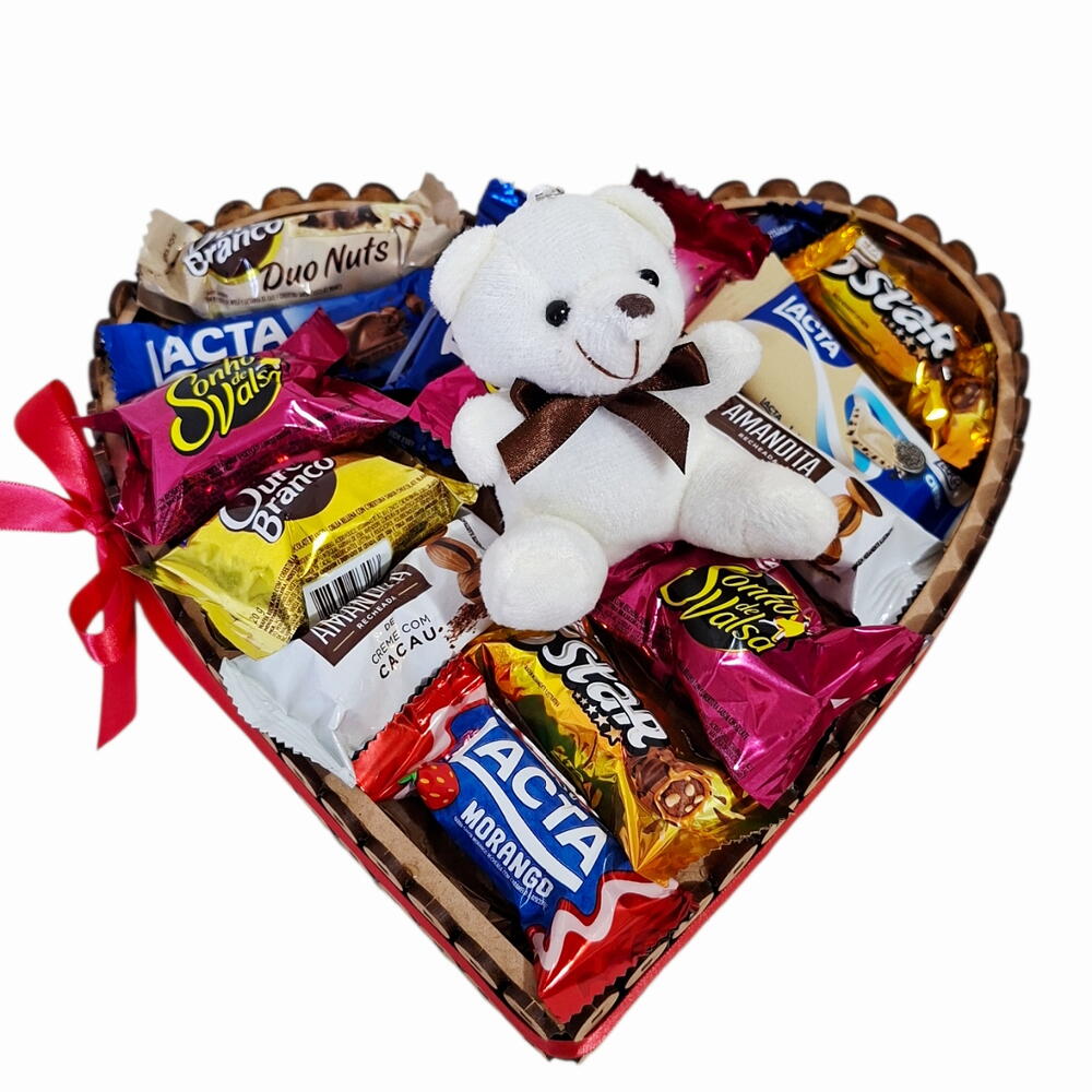 sacola kraft - 1 un. bombons lacta ou nestlé - 14 un. celofane e laço - 1 un. urso chaveiro de 10cm - 1 un. cesta coração mdf - 1 un.