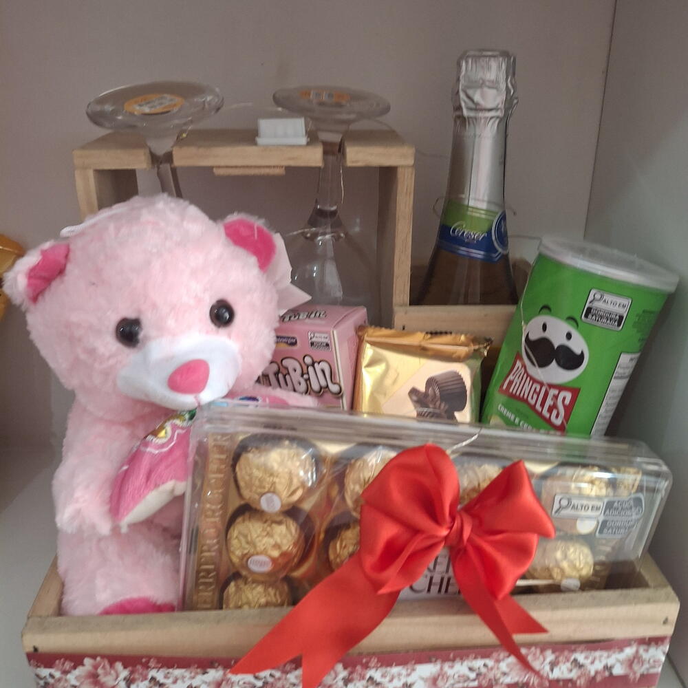 vinho - 1 un. nutella - 1 un. taças - 2 un. salamitos - 1 un. coraçãozinho de pélucia - 1 un. suporte em madeira - 1 un.