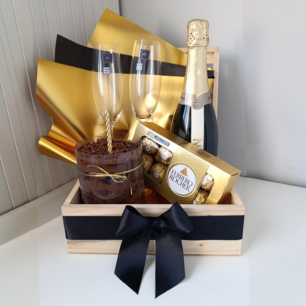 bombons ferrero rocher - 8 un. espumante chandon - 1 un. cesta de aniversário - 1 un. taças de cristal - 2 un. mini bolo de chocolate com vela dourada - 1 un. caixa rústica de madeira - 1 un. embalagem presenteável com laço e acabamento premium - 1 un.