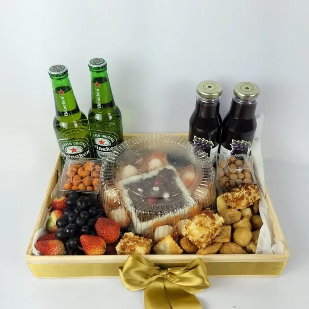 porção de uva - 1 un. porção de morango - 1 un. saco transparente e laço para embrulho do presente - 1 un. 2 long neck heineken - 330 ml 2 sucos de uva - 300 ml porções de amendoim - 2 un. torta pequena - 1 un. porção de mini salgados variados - 1 un. bandeja de pinus ornamentada com fita e laço de cetim - 1 un.